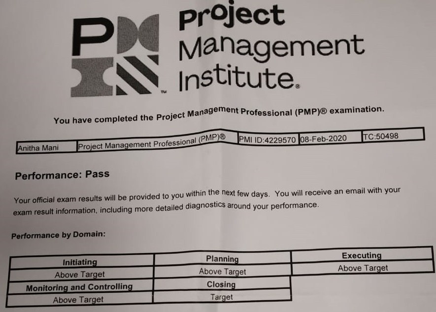 Excited to announce that I have passed my PMP exam in this lockdown period and earned this professional certification.Special thanks to Mr, Sanjay Kumar PMP®, CSM®, PMI® ACP, ITIL®, LSSBB®, AI-ML® and Shankar PMP from I-Tech guru for their training and support during this journey. My score is above target in all Process group.